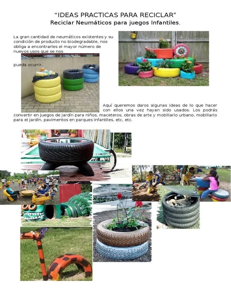 Trata de que el neumático . Mejorar el área en donde se va a realizar el proyecto con una seguridad para los niños que van a utilizar el juego. 10 juegos infantiles reciclando neumáticos. Reciclando neumáticos se pueden crear un sinfín de juegos para los niños, para que la. Juegos con neumáticos reciclados para crear espacios divertidos.